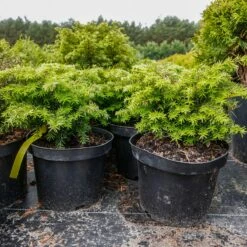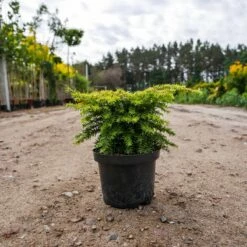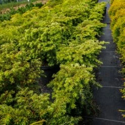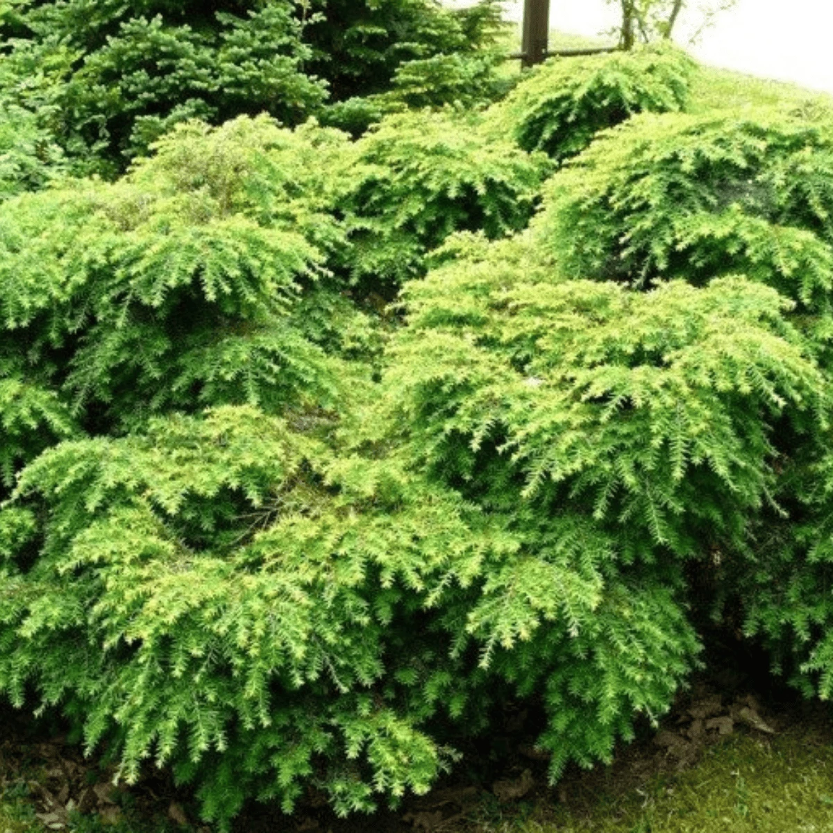 Szerokorozłożysty krzew z krótkimi, poziomo ułożonymi rozgałęzieniami, przyjmujący początkowo kształt regularnego gniazda. W starszym wieku przybiera kształt płaskiej i szerokiej półkuli. Dorasta do 1 metra wysokości. Dziesięcioletnie rośliny mają 30-40 cm wysokości i średnicę 50-80 cm. Wierzchołek drzewa cienki, wiotki, przegięty ku dołowi. Pędy jednoroczne cienkie, żółtobrązowe, owłosione. Igły długości 15 cm. Nie opadają na zimę.Jest dość wytrzymała na niskie temperatury, ale wrażliwa na suszę. Wymaga gleb żyznych, wilgotnych i ocienionych stanowisk. Znosi przycinanie i może być używana na żywopłoty. Po zabiegu takim rosliny silnie się rozgałęziają i zagęszczają. W miejscach cienistych i wilgotnych jest idealnym materiałem na strzyżone żywopłoty i szpalery. Doskonała na wrzosowiska, do ogrodów skalnych i nad oczka wodne. Ładnie prezentuje się też we frontowej części rabat, na cmentarzach oraz w pojemnikach.