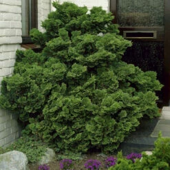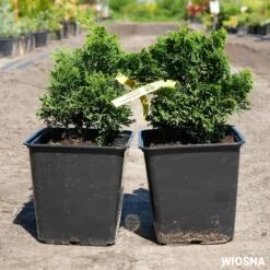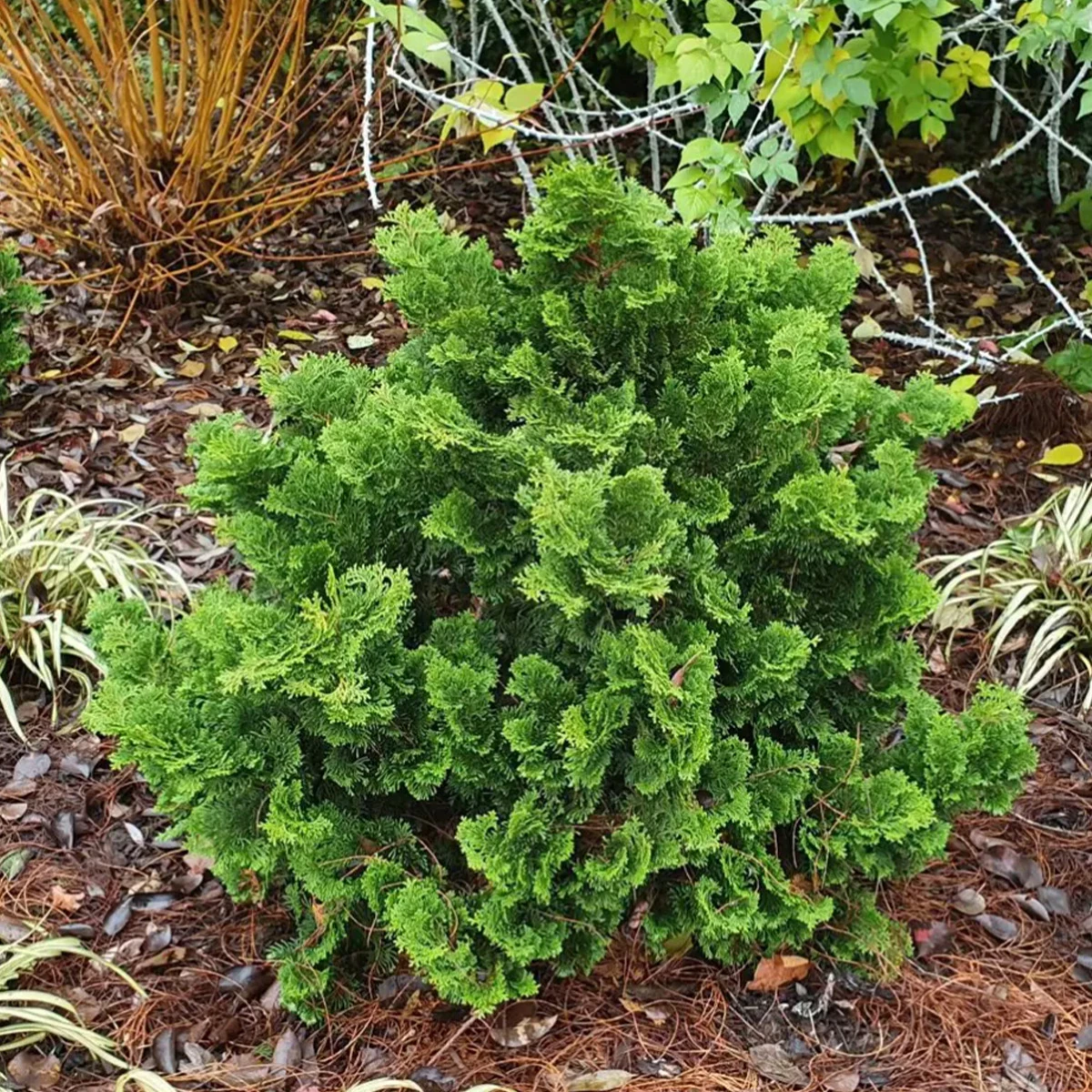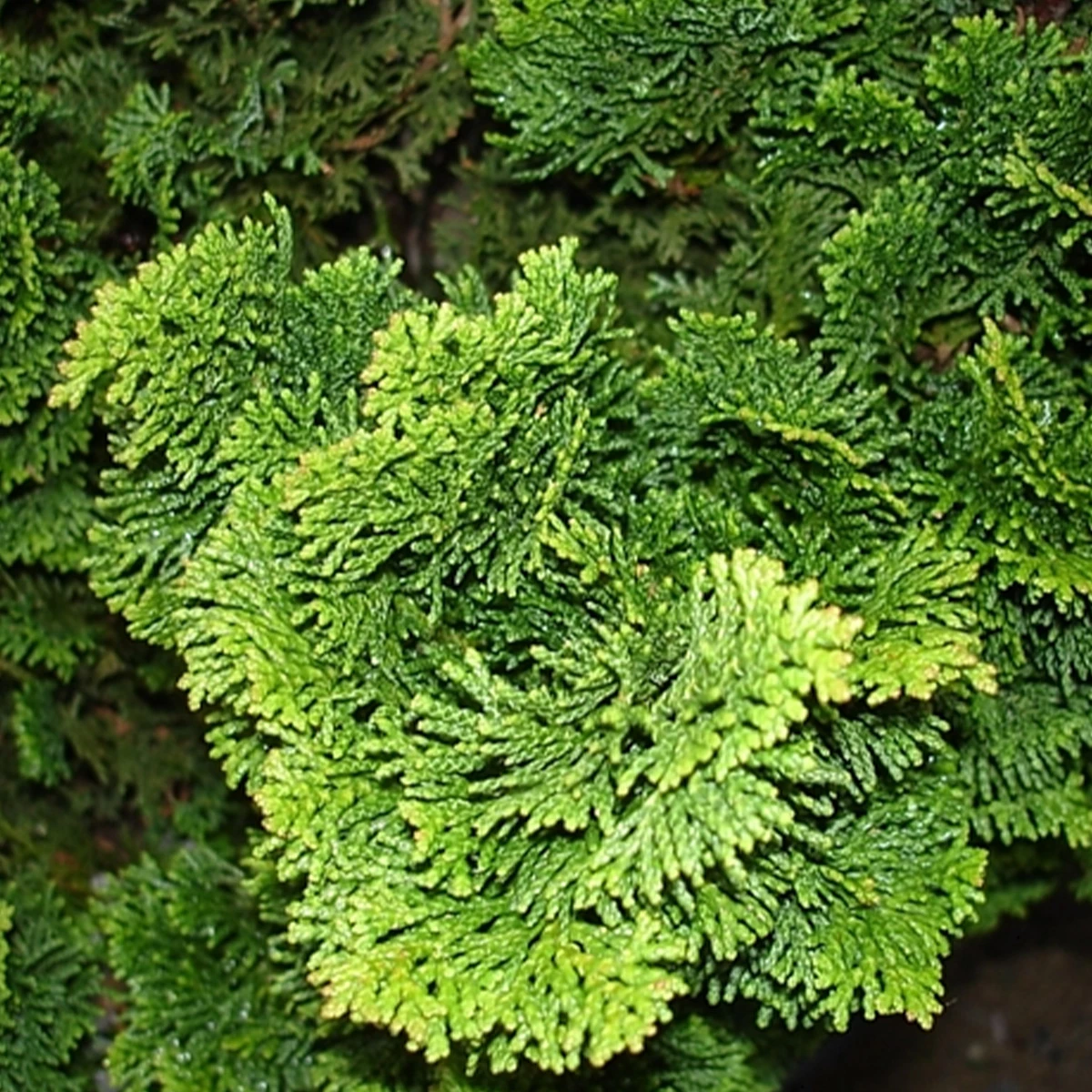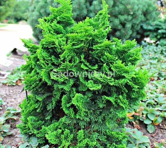 Karłowy krzew o początkowo kulistym, później nieregularnym pokroju i wolnym tempie wzrostu. Rocznie przyrasta zaledwie od 3 do 5 cm. Tworzy krótkie, mocno rozgałęzione pędy oraz płaskie, wachlarzykowate, muszlowato skręcone gałązki pokryte grubymi, zielonymi łuskami. Wiosną krzewy są soczyście zielone, szmaragdowe, połyskujące. Latem zieleń staje się ciemniejsza, ale nowe przyrosty mają wyraźny, jaśniejszy odcień.