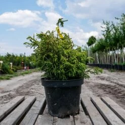 Karłowy krzew o początkowo kulistym, później nieregularnym pokroju i wolnym tempie wzrostu. Rocznie przyrasta zaledwie od 3 do 5 cm. Tworzy krótkie, mocno rozgałęzione pędy oraz płaskie, wachlarzykowate, muszlowato skręcone gałązki pokryte grubymi, zielonymi łuskami. Wiosną krzewy są soczyście zielone, szmaragdowe, połyskujące. Latem zieleń staje się ciemniejsza, ale nowe przyrosty mają wyraźny, jaśniejszy odcień.