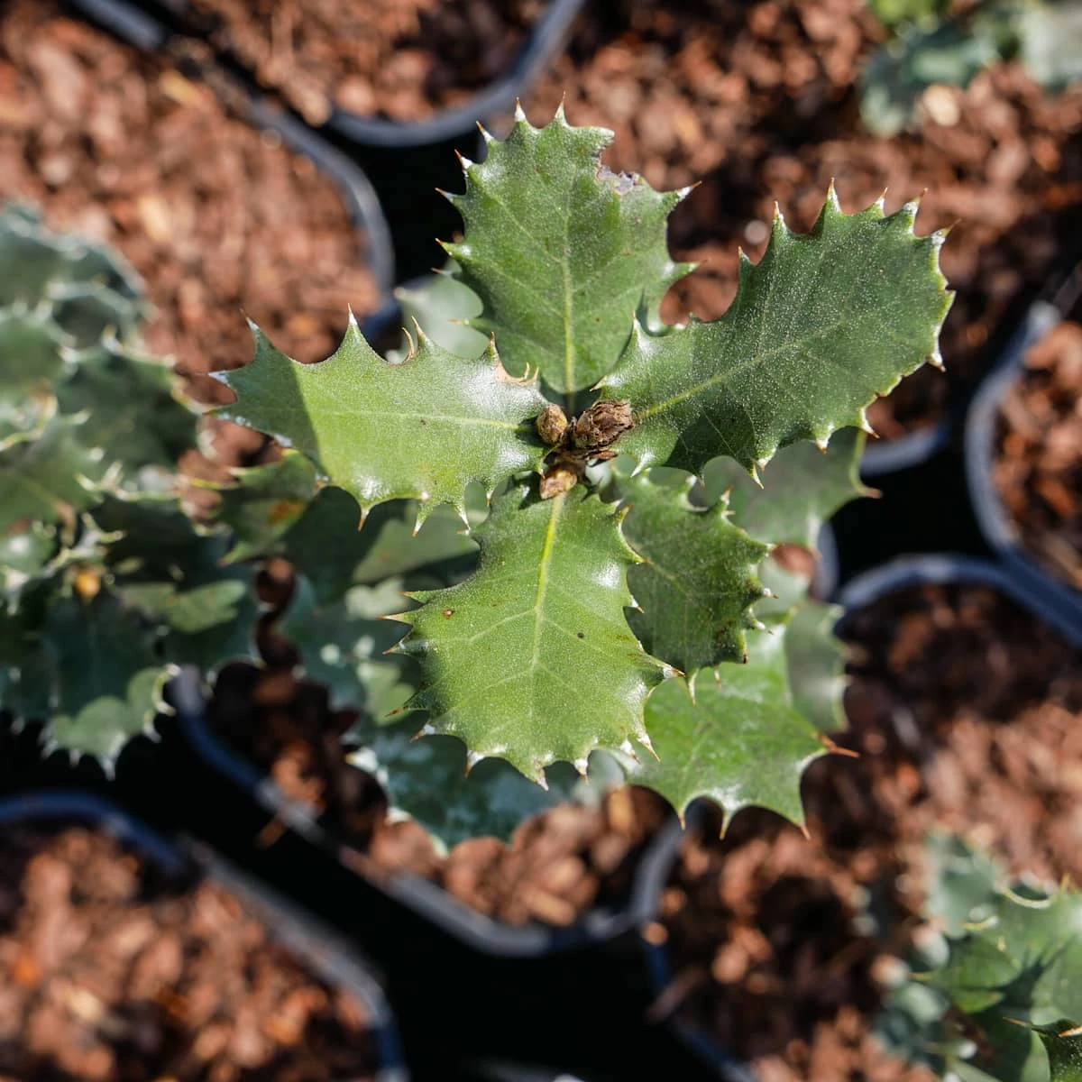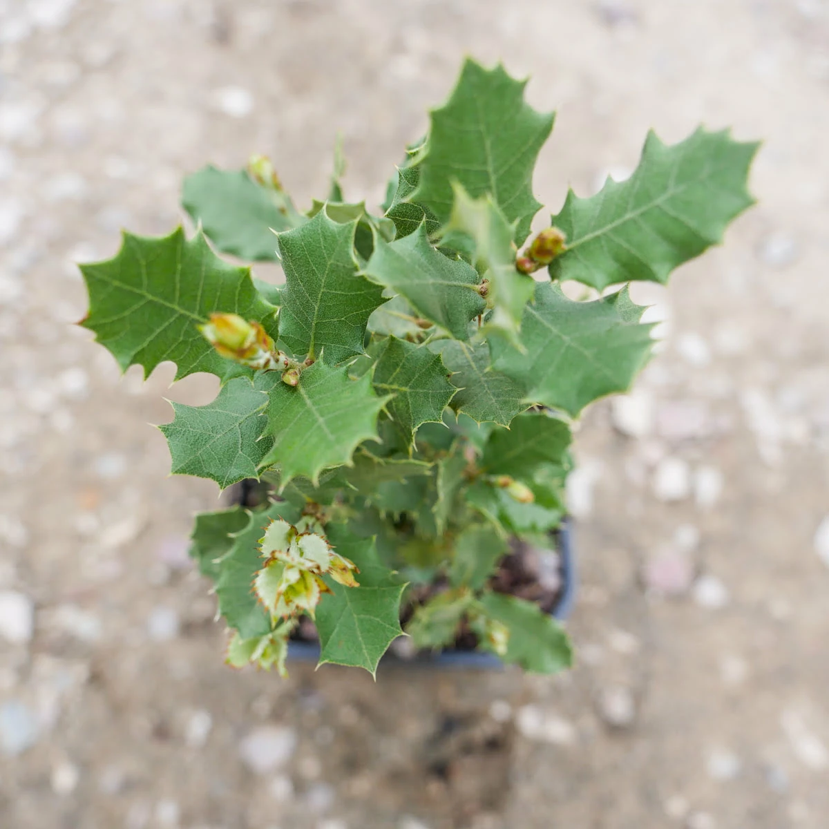 Dąb ostrolistny osiąga imponujące rozmiary i może dorastać do wysokości 25-30 metrów. Wyróżnia się gęstą, wiecznie zieloną koroną, która nadaje jej piękny wygląd przez cały rok. Liście są skórzaste, błyszczące oraz spiczaste, co skłoniło do nadania jej nazwy „ostrokrzew”. Mają one kształt eliptyczny lub podłużny oraz osiągają długość od 4 do 8 centymetrów. Górna część liści ma intensywnie zielony kolor, natomiast dolna część jest jaśniejsza.
