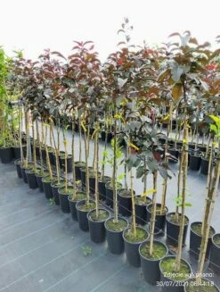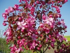 Niezwykle dekoracyjna odmiana dorastająca do 5 m, ozdobna z błyszczących ciemnoczerwonych liści oraz bordowoczerwonych kwiatów. Kwitnie w maju. Najlepiej rośnie na glebach świeżych, przepuszczalnych i na stanowiskach słonecznych. Rajskie jabłuszka nie tylko uatrakcyjniają ogród jesienią i zimą, możemy