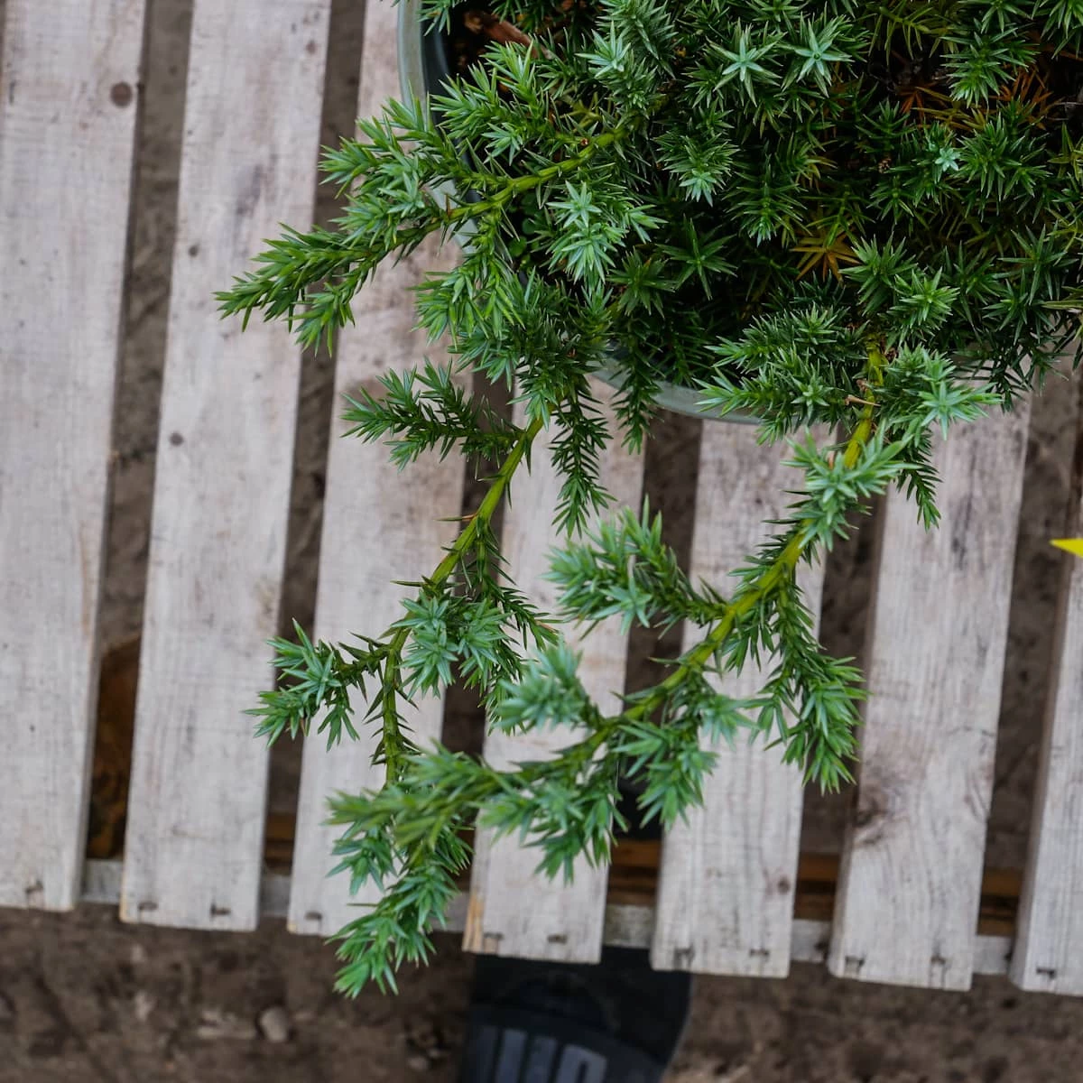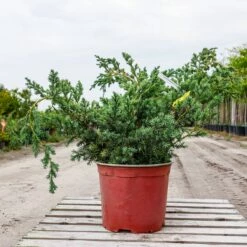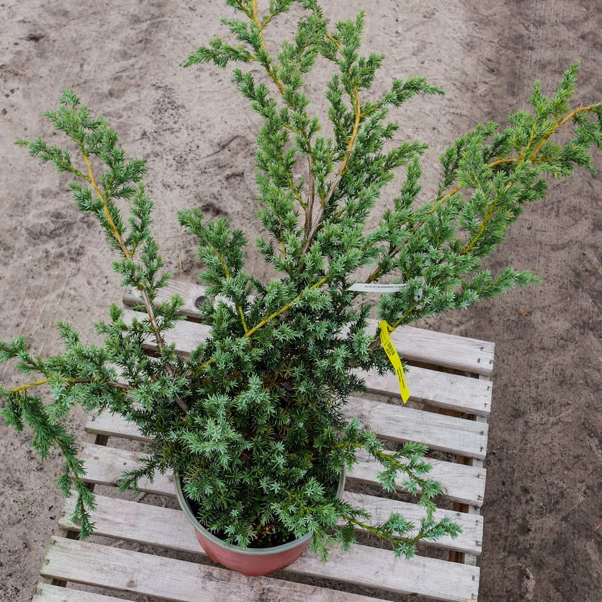Szybko rosnący, bujny krzew o stożkowatej sylwetce; pędy wzniesione, ich końce łukowato przewisają. Ulistnienie igiełkowate, igły długości 7-12 mm, bardzo kłujące. Jest to najbardziej srebrzystoniebieski z jałowców chińskich (ale młode przyrosty są brązowawe); zapewne mieszaniec z jałowcem łuskowatym. W pełni mrozoodporny. Jałowiec ten można zastosować do wielu kompozycji a w szczególności w miejsca o trudnych warunkach bytowych .