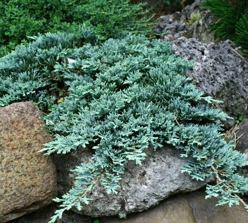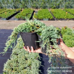 Juniperus horizontalis Icee blue| Krzew o pędach niebiesko-srebrzystych, płożących się, wolno rosnący, dorastający do ok. 15 cm wysokości i 2 m średnicy. Dobrze rośnie na każdej glebie, byle nie ciężkiej, gliniastej i podmokłej, stanowisku słonecznym. Polecana do ogrodów skalnych, przydomowych, pojemników, na murki i jako roślina okrywowa. W pełni wytrzymała na mrozy. Cenna odmiana.