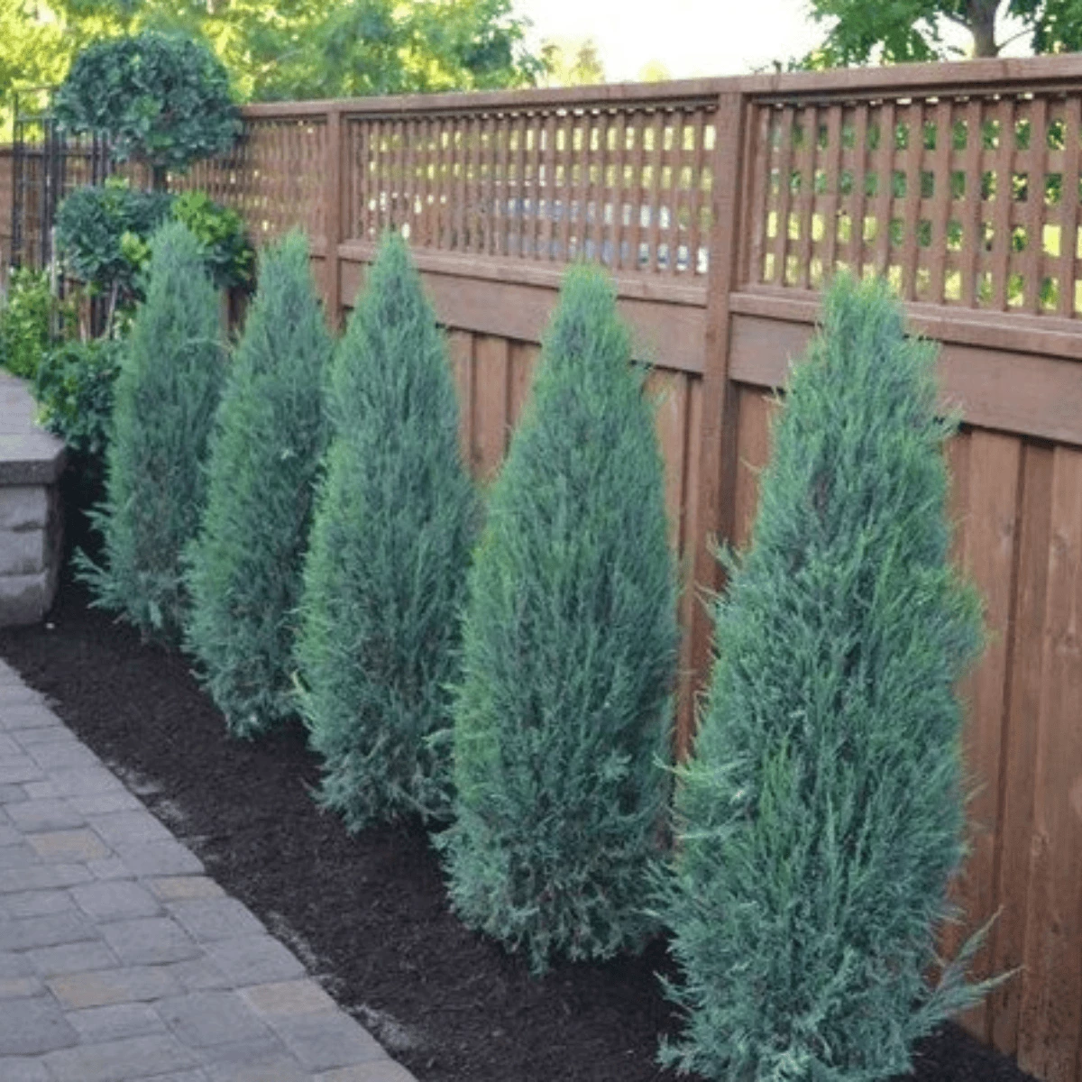 – wąskie jałowce (np. Skyrocket, Blue Arrow) sadzimy co 50-60 cm