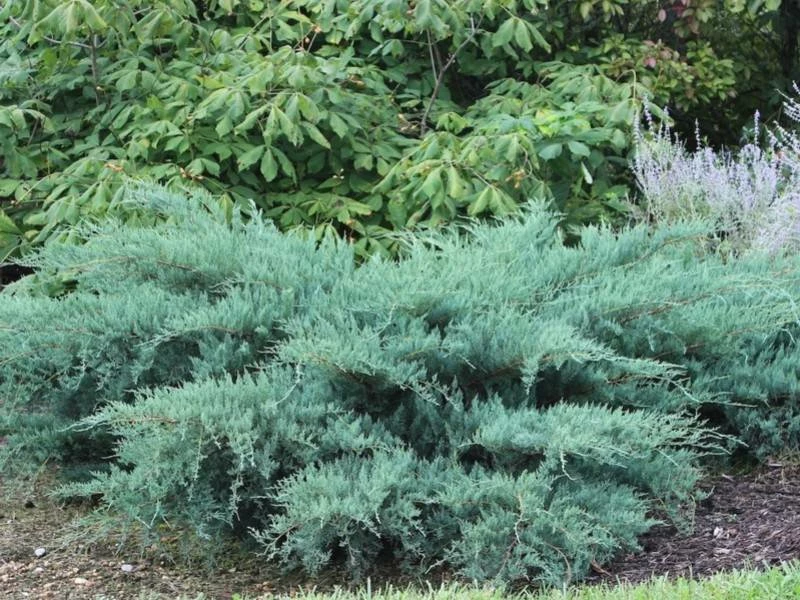 Rozłożysty, silnie rosnący krzew iglasty, rocznie przyrasta około 25 cm. Po 10 latach uprawy osiąga 1 m wysokości i 2-3 m szerokości. Część gałęzi wznosi się, pozostałe są ułożone poziomo, końce pędów zwisają. Najmłodsze pędy są wałeczkowate, pokryte srebrzystoszarymi łuskami. Na gałązkach widać nieliczne, przylegające igły. Wiosną na starszych krzewach, na wierzchołkach gałązek, tworzą się obficie bardzo drobne, kremowo-brązowe szyszki męskie produkujące pyłek. Szyszkojagody niewielkie, kuliste, pokryte srebrzystym nalotem. Wymagania glebowe i wilgotnościowe bardzo małe. Krzew doskonale sprawdza się sadzony na wszystkich przepuszczalnych glebach ogrodowych, ale wymaga pełnego nasłonecznienia.