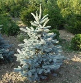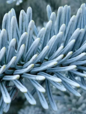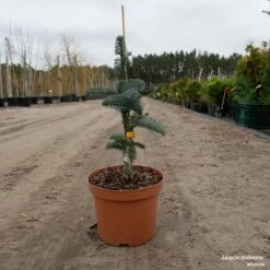 Drzewo ma nieregularny pokrój. Docelową wysokość osiąga po 30 latach. Igły mają kolor srebrzystoniebieski, nie kłują. Igły układają się promieniście.