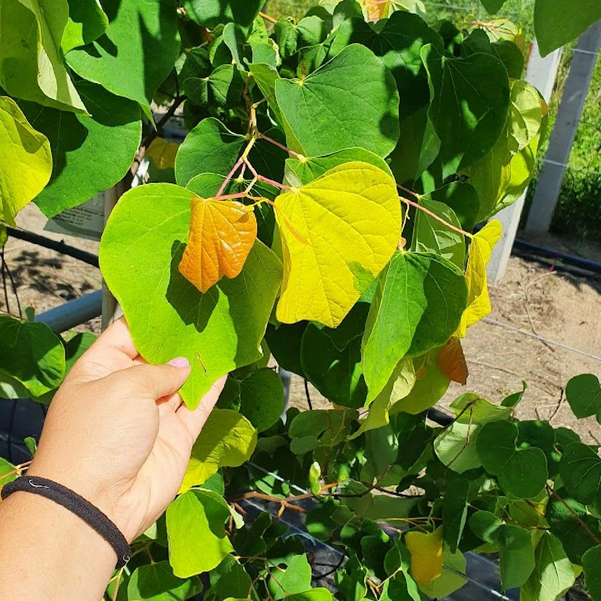 Niewielkie drzewo o 偶贸艂to-pomara艅czowych li艣ciach i roz艂o偶ystym pokroju osi膮gaj膮ce 3-4 m wysoko艣ci. Blaszki li艣ciowe s膮 du偶e, sercowate, osadzone na d艂ugich ogonkach, najm艂odsze s膮 intensywnie pomara艅czowe, z wiekiem staj膮 si臋 jasnozielone. Latem na jednym drzewie widoczne s膮 li艣cie we wszystkich fazach rozwoju, dzi臋ki czemu ro艣lina pozostaje atrakcyjnie wielobarwna niemal przez ca艂y sezon. R贸偶owe kwiaty rozwijaj膮 si臋 razem z li艣膰mi na prze艂omie kwietnia i maja, s膮 zebrane po kilka w p臋czkach. Kwiaty tworz膮 si臋 bezpo艣rednio na pniach i konarach oraz na m艂odych ga艂膮zkach. Ro艣lina wymaga stanowisk ciep艂ych i os艂oni臋tych, s艂onecznych, gleby o odczynie oboj臋tnym do zasadowego, przeci臋tnie zasobnej i umiarkowanie wilgotnej. Odmiana odporna na susz臋, upa艂y, a tak偶e bardziej odporna na mr贸z, ni偶 gatunek rodzicielski. Drzewo polecane do kameralnych ogrod贸w聽w miastach, na patia lub do sadzenia pomi臋dzy budynkami.