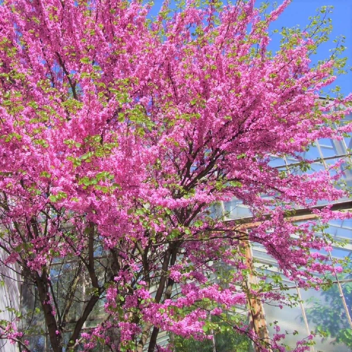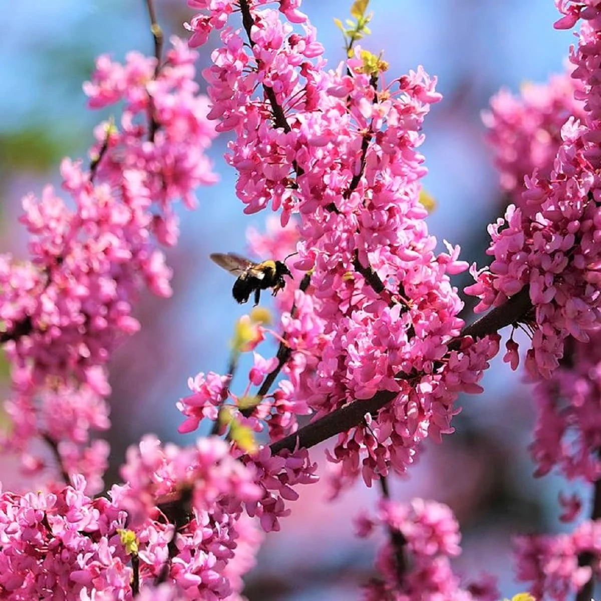 Li艣cie matowozielone, nerkowate, na wierzcho艂kach zaokr膮glone. Jesieni膮 przebarwiaj膮 si臋 na 偶贸艂to. Kwiaty purpurowor贸偶owe, zebrane po kilka w p臋czku. Kwitn膮 obficie zar贸wno na cienkich ga艂膮zkach jak i na grubych, a nawet na pniu. Kwitn膮 kwiecie艅 – maj. Kwiaty s膮 jadalne, s艂odko-kwaskowate, mo偶na dodawa膰 do sa艂atek.聽