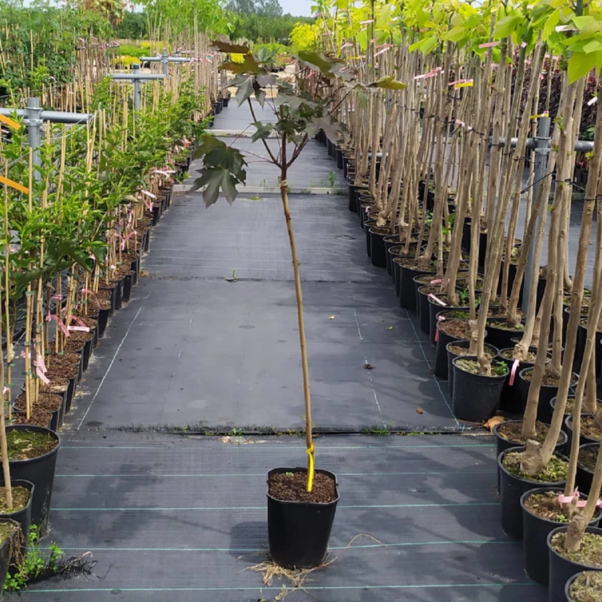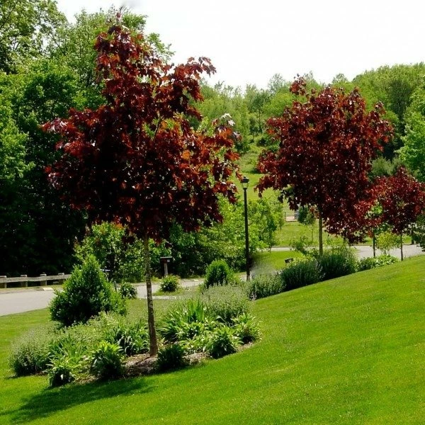 Drzewo o szerokiej i regularnej koronie. Jego wysoko艣膰 zale偶y od punktu szczepienia. Mo偶e by膰 te偶 dowolnie formowane. Li艣cie du偶e, do 15 cm d艂ugo艣ci, d艂oniaste, 5-7 klapowe, o d艂ugim ogonku. M艂ode li艣cie matowe, br膮zowoczerwone, p贸藕niej intensywnie ciemnoczerwone. Zachowuj膮 kolor przez ca艂y okres wegetacji. Kwiaty do艣膰 du偶e, zebrane w baldachogrona.