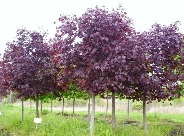 Du偶e drzewo o okaza艂ej, r贸wnomiernej koronie. W wieku 25-30 lat osi膮ga wysoko艣膰 12-15 m. Li艣cie s膮 du偶e, d艂oniaste, 5-7 klapowe i osi膮gaj膮 d艂ugo艣膰 do 15 cm, maj膮 d艂ugi ogonek. M艂ode li艣cie s膮 matowe, br膮zowoczerwone, p贸藕niej intensywnie ciemnoczerwone i zachowuj膮 ten kolor przez ca艂y okres wegetacji. Kwiaty s膮 do艣膰 du偶e, zebrane w baldachogrona, zielonkawo-偶贸艂tawe i kwitn膮 przed rozwojem li艣ci. Ro艣lina ta jest bardzo miododajna i jedn膮 z najlepszych odmian drzew o ciemnym zabarwieniu li艣ci. Doskonale znosi wszystkie gleby z wyj膮tkiem skrajnie suchych lub podmok艂ych. M艂ode ro艣liny dobrze znosz膮 zacienienie. Drzewo to jest odporne na niskie temperatury i warunki miejskie, dlatego te偶 jest doskona艂e do sadzenia w parkach i zieleni osiedlowej, w otoczeniu nowoczesnej architektury oraz jako ro艣lina alejowa.