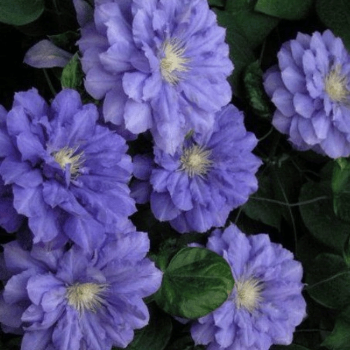 JAK WYGLĄDA: Kwiaty duże, śr. 13 cm, zawsze pełne, ciemnoniebieskie, z jasnożółtymi pylnikami na białych nitkach. Kwitnie V˗VIII, słabiej VIII˗IX.