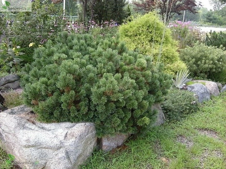 Pinus mugo var.pumilio| Niski, rozpostarty krzew o powolnym wzroście, osiągający po 30 latach około 2 m wys. przy ponad 2 m średnicy. Pędy nisko rozpostarte nad ziemią, ścielące się. Igły krótkie, ciemnozielone, kłujące.