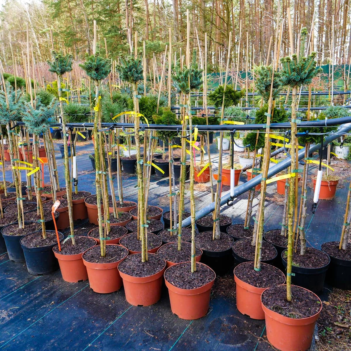 Świerk biały Cecilia szczepiony na pniu to odmiana tego drzewa, która jest szczególnie popularna w dekoracji ogrodów i terenów zielonych. W przeciwieństwie do standardowego świerka białego Cecilia, który rośnie jako wolno rosnące drzewo iglaste, świerk biały Cecilia szczepiony na pniu rośnie jako niewielkie drzewko z kulistą koroną, co sprawia, że jest idealnym drzewem dekoracyjnym do ogrodów, parków, alejek i innych terenów zielonych