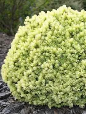 Pędy cienkie, wyrastające promieniście ze środka krzewu, tworzą jasnozielone kule o nieregularnej powierzchni. Gałązki krótkie, bardzo gęsto upakowane, jedna obok drugiej. Igły na młodych przyrostach złote, krótkie, długości 8 mm, delikatne, ułożone promieniście wokół gałązek, słabo kłujące w dotyku.