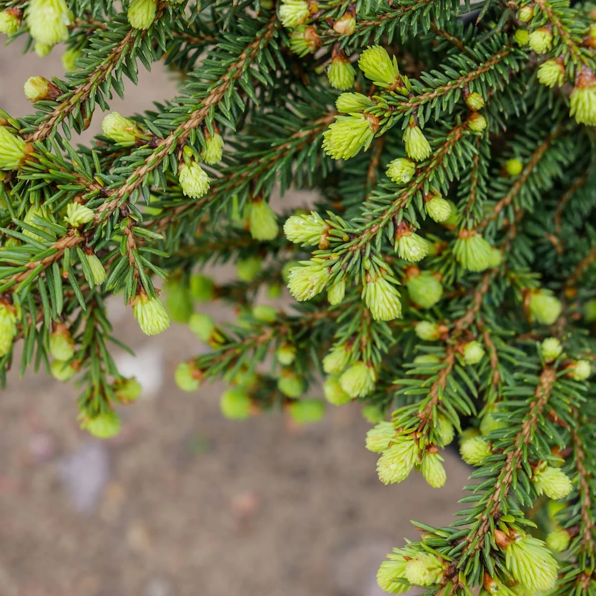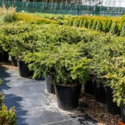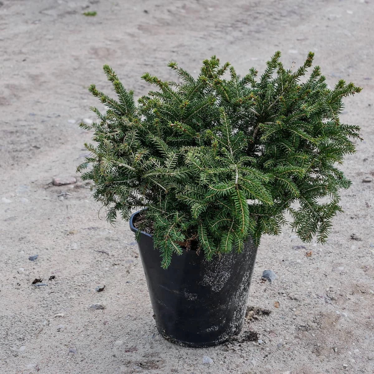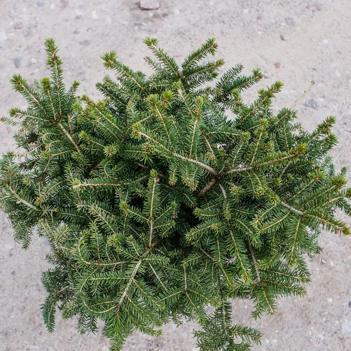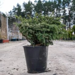 Karłowy, gęsty krzew o pokroju gniazdkowym, u młodych roślin z charakterystycznym zagłębieniem w środku. Osiąga w wieku 10 lat około 0,5m wysokości przy 1m średnicy. Pędy cienkie i giętkie; igły krótkie, jasnozielone.