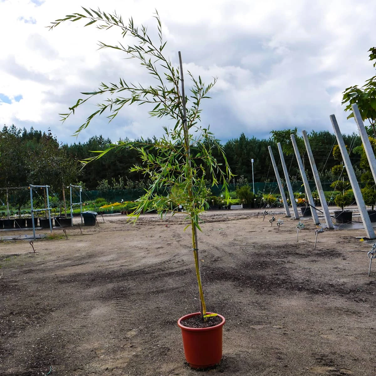 Drzewo o szerokiej, gęstej, regularnej koronie osadzonej na niskim pniu, z długimi, wiotkimi i silnie zwisającymi gałęziami. Długopędy cienkie, nagie, złocistożółte i błyszczące. Klon męski, ale obok kotek z kwiatami pręcikowymi pojawiają się kotki żeńskie, co jest cechą charakterystyczną dla tego drzewa. Sadzi się ją w parkach, po wsiach i w miastach. Szczególnie malownicze są drzewa pojedynczo rosnące nad stawami, wzdłuż kanałów i w pobliżu innych zbiorników wodnych. W parkach należy sadzić na skraju rozległych łąk. Unikać sadzenia w grupach z innymi drzewami, gdyż wówczas wierzba płacząca nie ma warunków swobodnego kształtowania malowniczej korony. Jest mało wymagająca w stosunku do gleby. Dobrze rośnie nawet na glebach stosunkowo ubogich i piaszczystych, lecz wymaga stanowiska w pełni słonecznego.