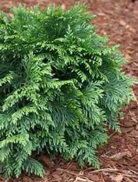 Karłowa odmiana o ciemnoszmaragdowa, błyszczących gałązkach, początkowo kulista, później rosnąca w formie szerokiego stożka.
